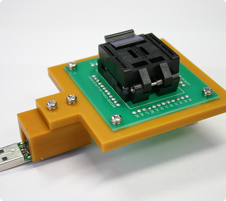 1.メモリーコントローラ(QFP)の交換を可能にするため、ICソケットを用意。 そのままではUSBメモリーに搭載できないので、ソケット実装用基板を製作。